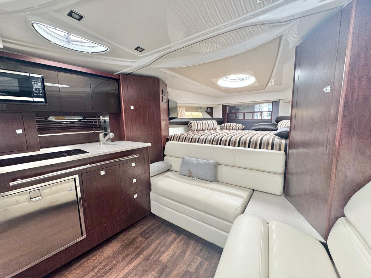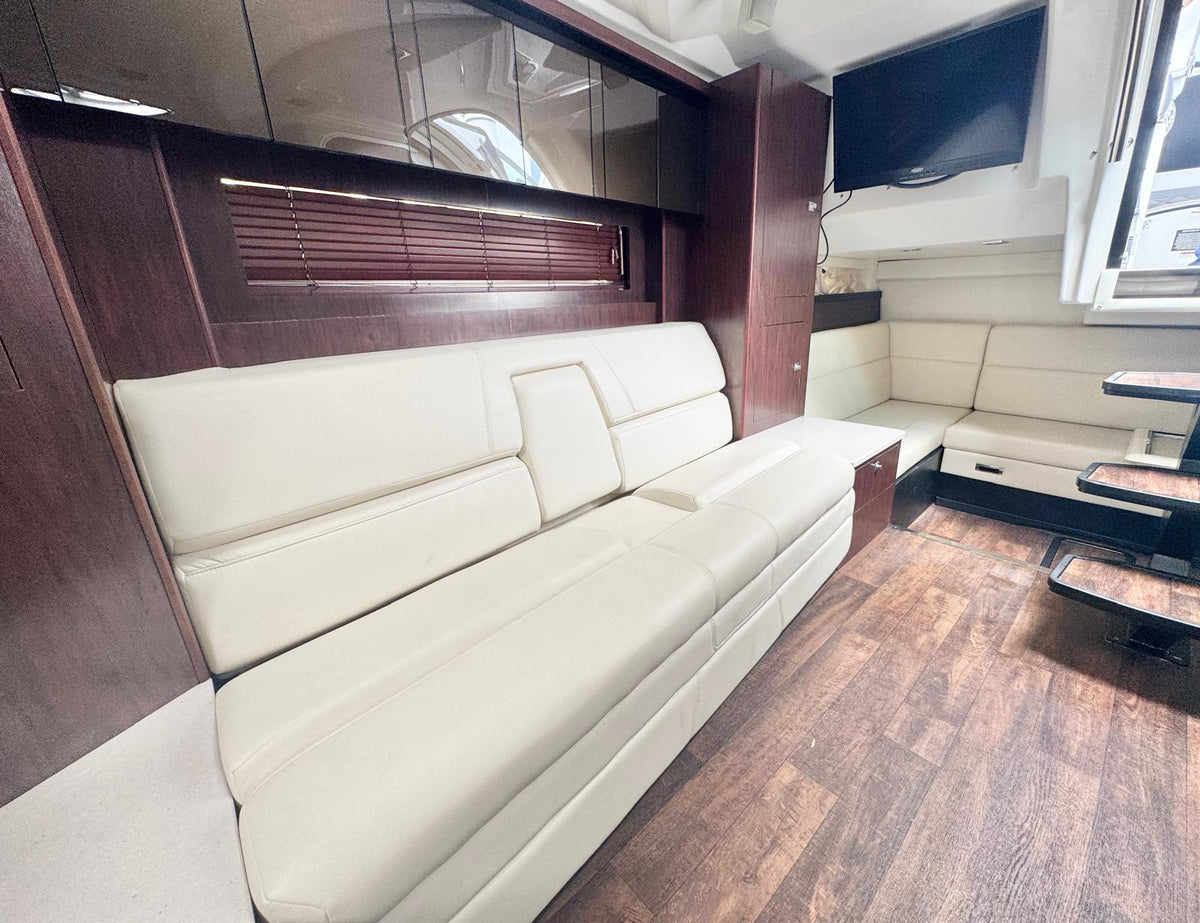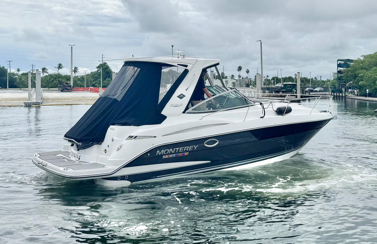 Below deck, the cabin is a testament to Monterey’s commitment to luxury and functionality. The open and airy salon includes a well-appointed galley with a microwave, refrigerator, and solid-surface countertops. The forward V-berth and an aft cabin provide comfortable sleeping arrangements for four, making it perfect for weekend getaways.