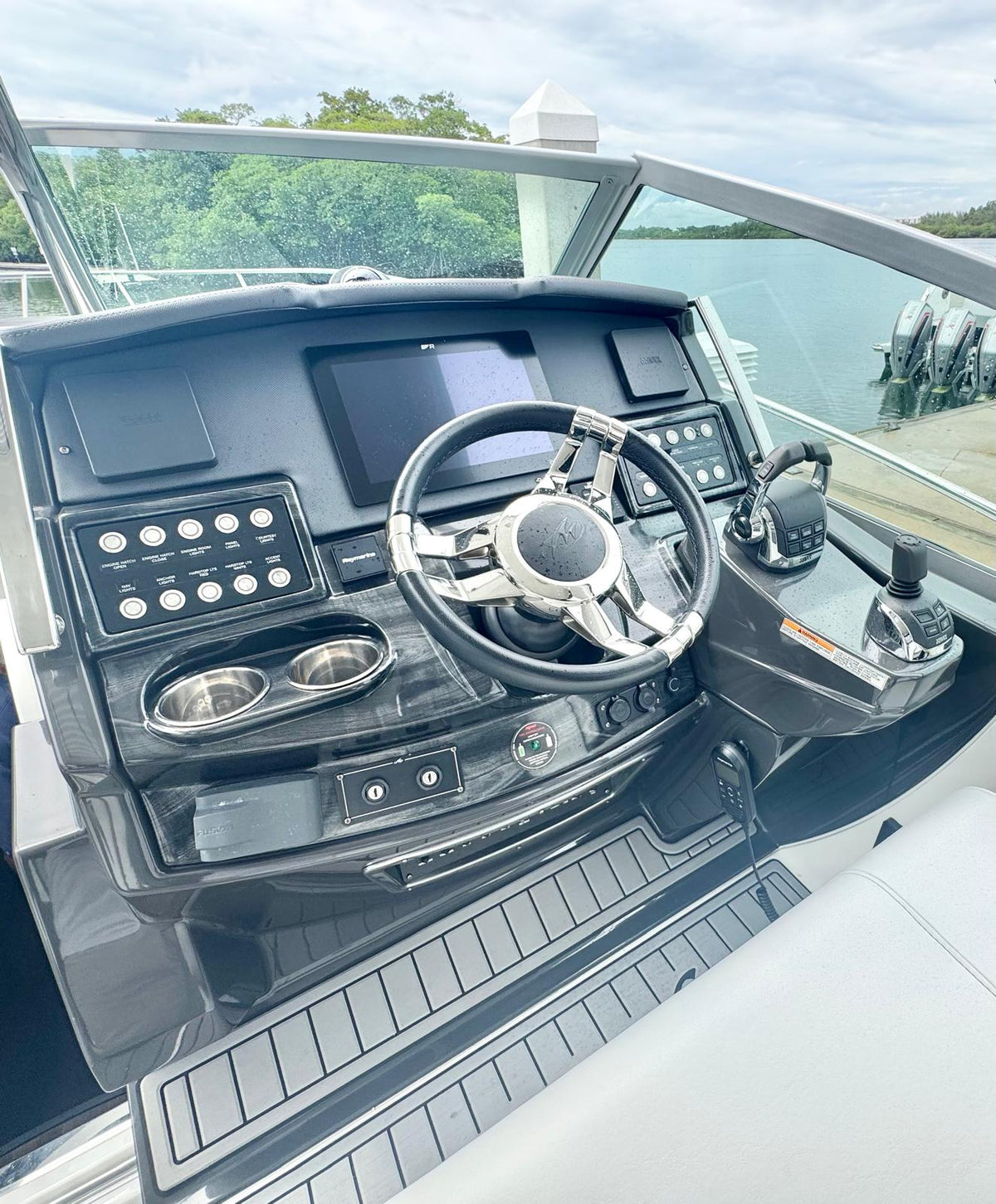 The boat’s helm is equipped with the latest electronics, offering a clean, intuitive layout for easy command.